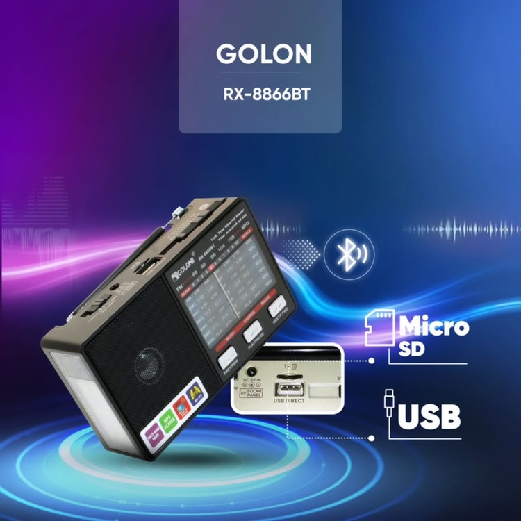 رادیو گولون با ۲ عدد چراغ قوه بلوتوث و باتری آمپری رمخور، دارای فلش خور و بلندگوی باکیفیت. اقلام همراه شامل کابل شارژ و آنتن. این محصول سبک و کم وزن است و مناسب استفاده در همه جا میباشد.