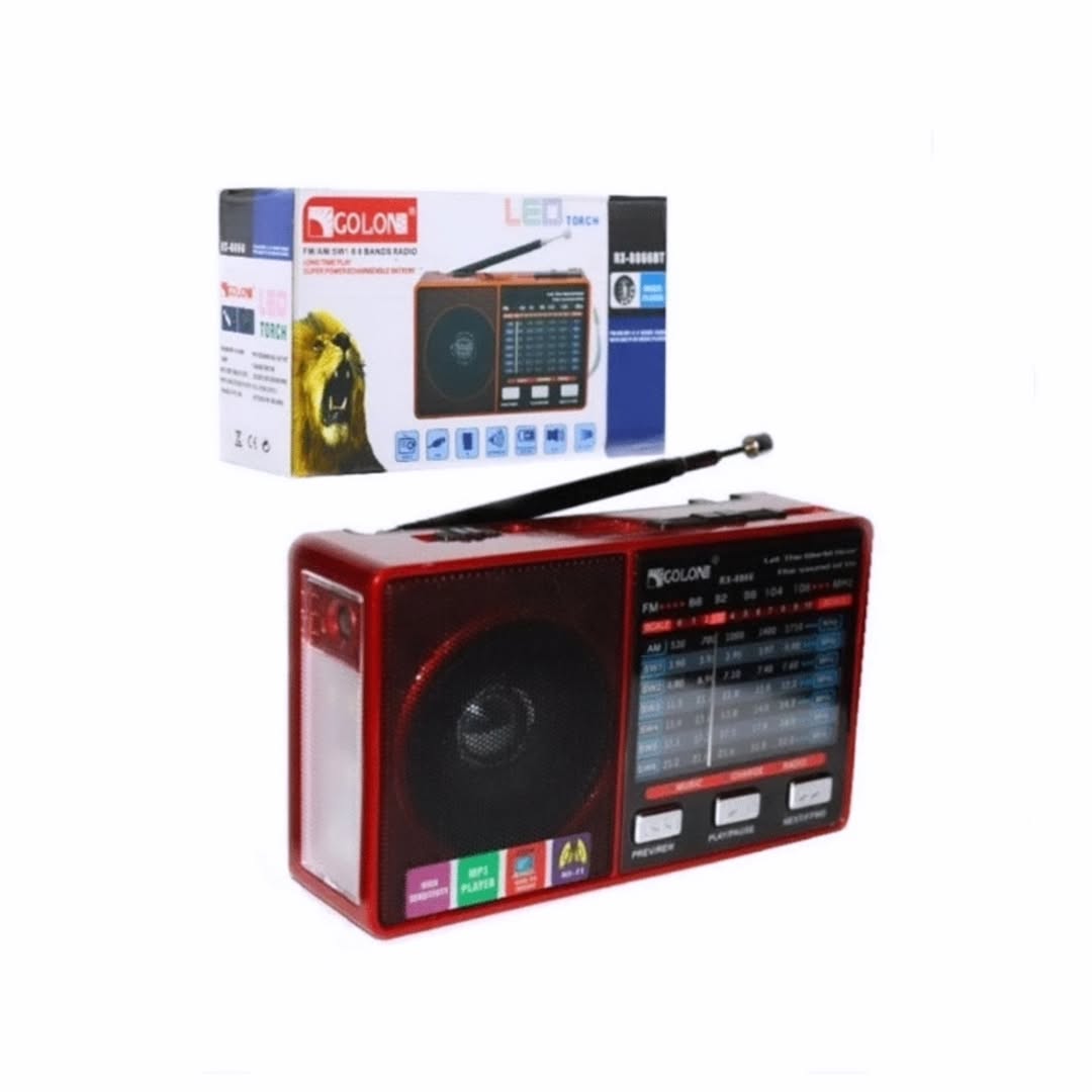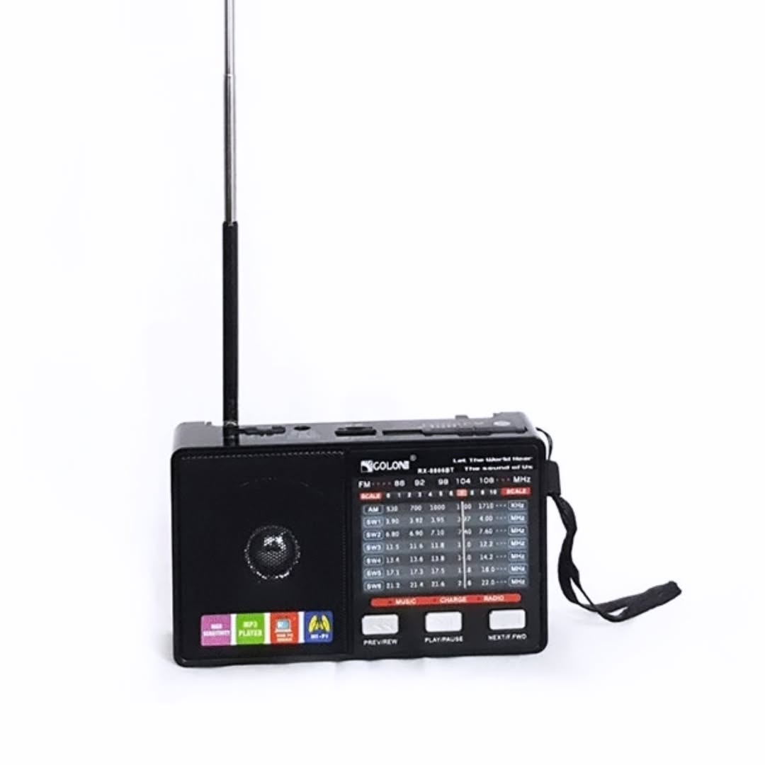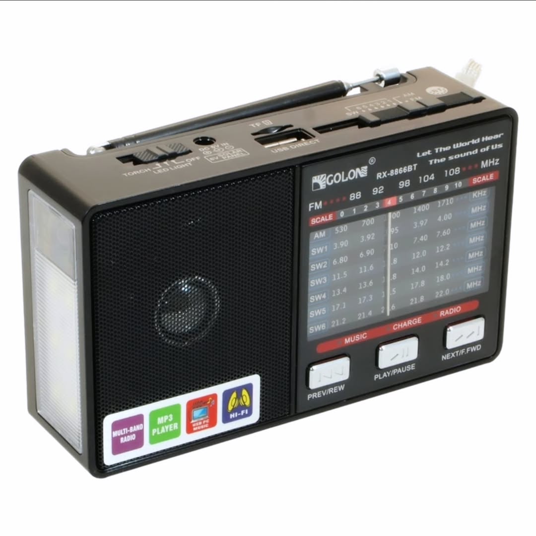 رادیو گولون با ۲ عدد چراغ قوه بلوتوث و باتری آمپری رمخور، دارای فلش خور و بلندگوی باکیفیت. اقلام همراه شامل کابل شارژ و آنتن. این محصول سبک و کم وزن است و مناسب استفاده در همه جا میباشد.