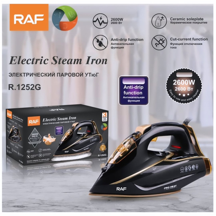 اتو اورجینال برند راف با توان مصرفی ۲۶۰۰ وات و مخزن آب ۴۵۰ میلی لیتر. مجهز به سیستم ضد چکه و ضد رسوب با درجه حرارت قابل تنظیم و بخار دهی لحظه ای و پیوسته. دارای بدنه پلاستیکی با کیفیت و کفی بزرگ سرامیکی ضد خش.