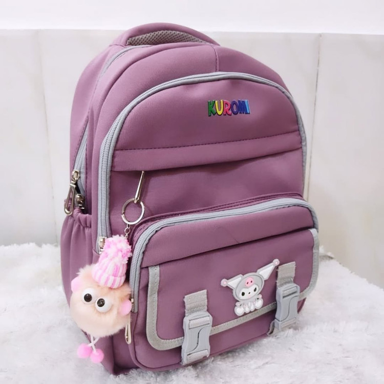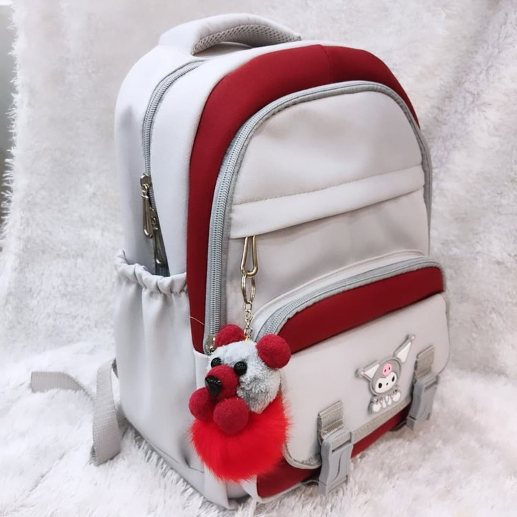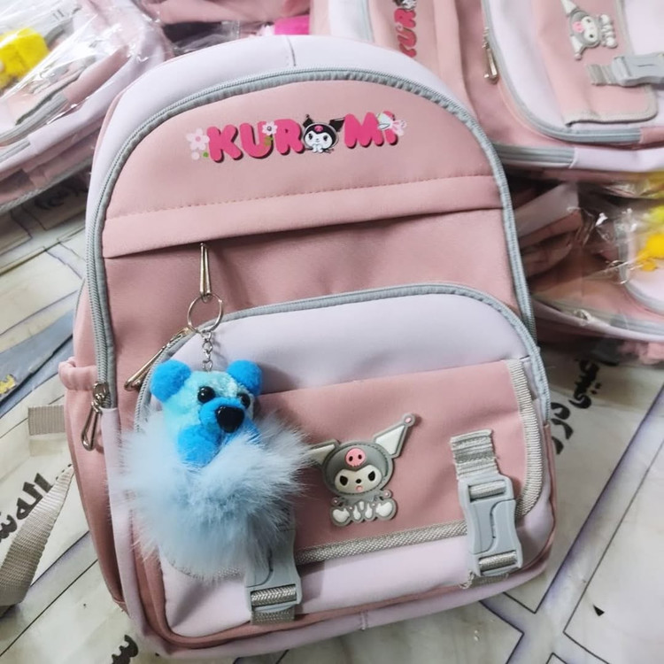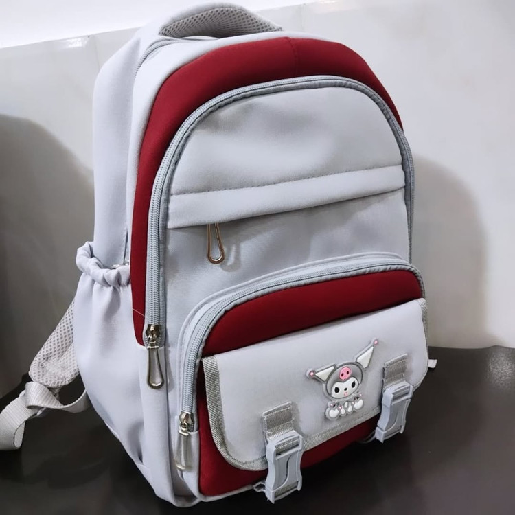 new model مدل : کرومی kuromi سایز : 3241 جنس : خارجی : مناسب کیفیت : درجه یک عالی پشتی کامل عرقگیر ، دسته عرق گیر،5زیپ مجزا،،جا قمقمه رنگ :صورتی ،سفید قرمز،..